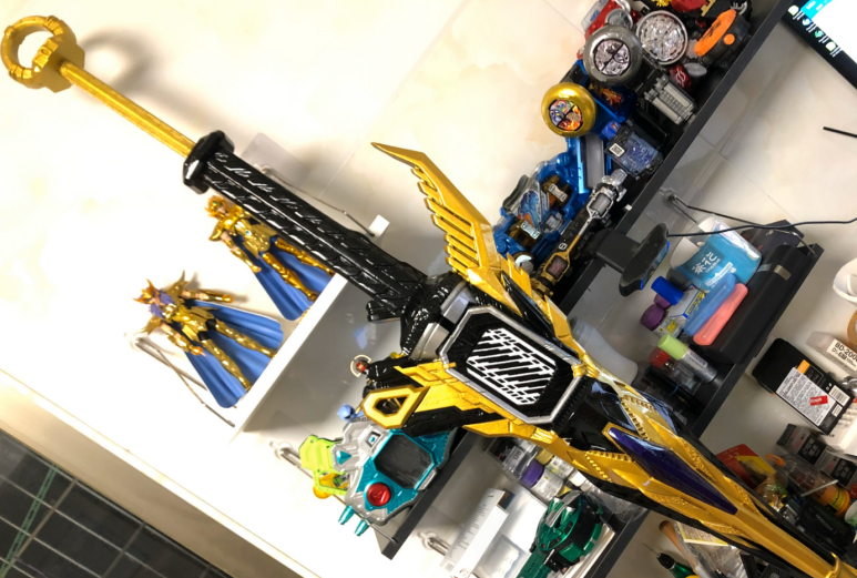 还有武器方面,大家也知道千位劫取者算是千骑的专属武器,能够劫取任何骑士的力量并进行转化,因此千骑的成长其实是没有限制的,只要能够吸到力量,就能够反击,因此这把武器也是被一比一的完美还原了,这个造型可谓是相当华丽,比起万代的玩具,要好太多了,就是不知道音效方面怎么样,不过这么大,应该是单纯的武器。