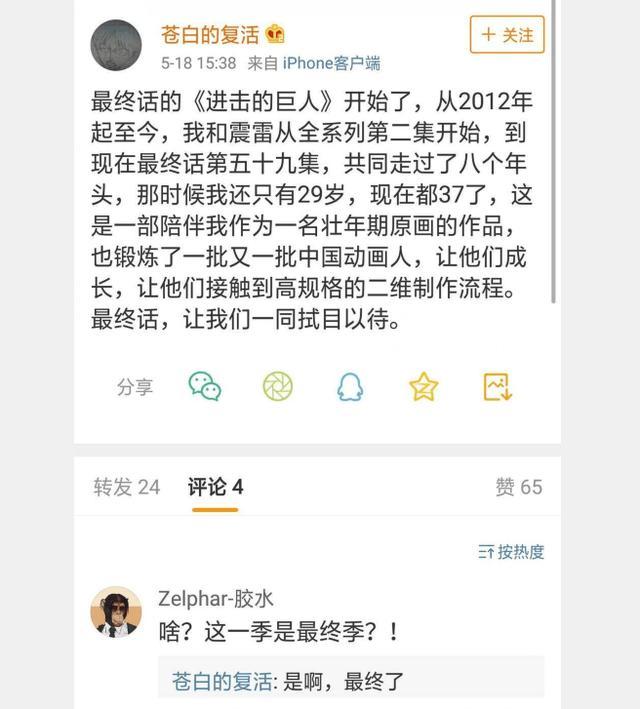 不知道大家还记不记得去年有个中国原画师在微博发消息称《进击的巨人》第三季是WIT做的最后一季。当初大家理解成了动画项目已经结束了,没想到是换公司了。