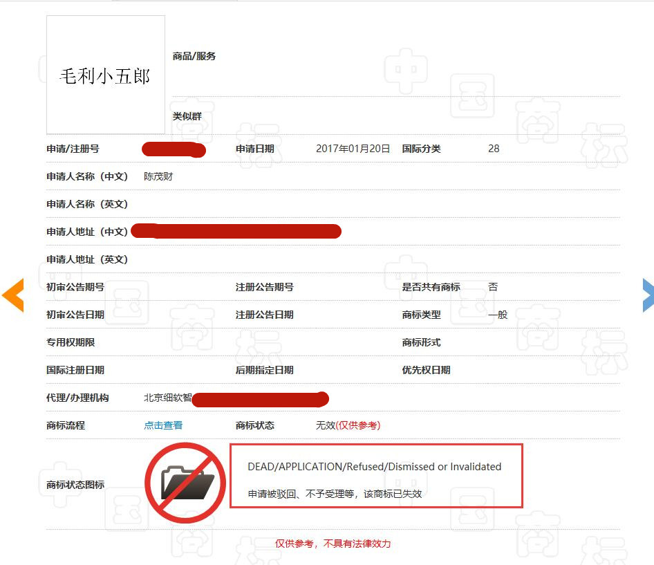 好奇的我再次搜了一下“毛利小五郎”,发现也被一个叫陈茂财的人抢注了,当然,毛利小五郎比较幸运的是这个商标,被驳回,不然,以后,真的见不到小五郎了。