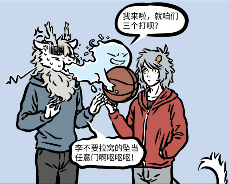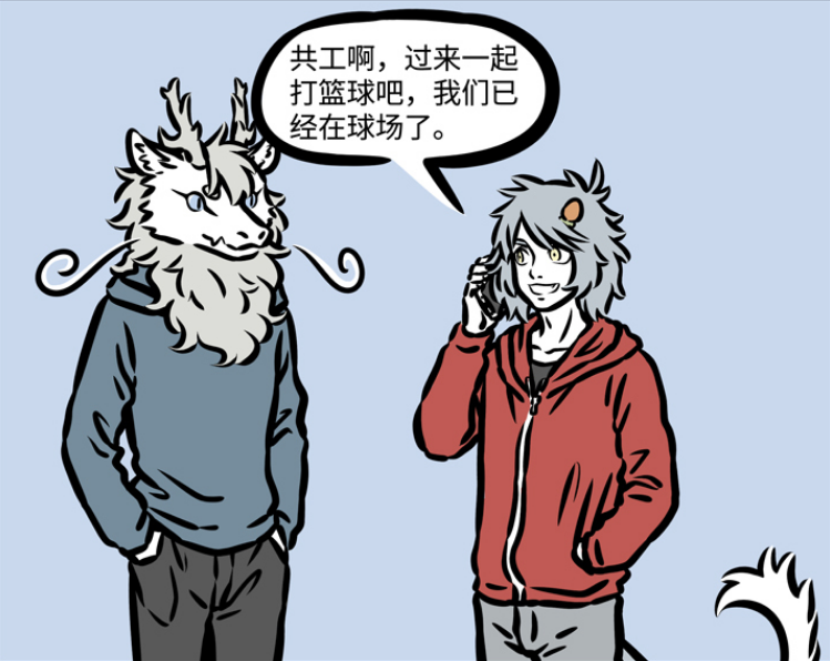 篮球是一项很受人喜爱的运动,不管人类喜欢,各路神仙也格外喜欢。这不哮天犬和烈烈就准备一起打篮球,不过因为人数太少,哮天犬拿起了自己的手机打给了水神共工,哮天犬想让共工一起来玩,他告诉共工他们已经到了篮球场了。