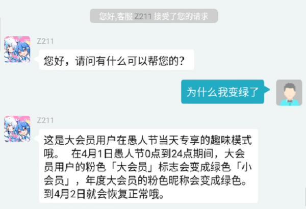 “这是大会员用户在愚人节当天专享的趣味模式哦。在4月1日 愚人节0点到24点期间,大会员用户的粉色「大会员」标志会变成绿色「小会员」,年度大会员的粉色昵称会变成绿色,到4月2日就会恢复正常哦。”