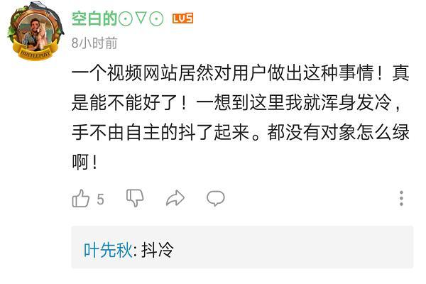 “一个视频网站居然对用户做出这种事情!真是能不能好了!想到这里我就浑身发冷,手不由自主地抖了起来……都没有对象怎么绿啊!”