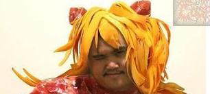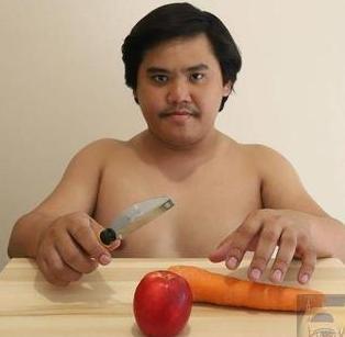 小哥先用家用厨房中必备的削皮器,将胡萝卜削成了片状。之后,小哥硬是按照明日香的发型,将胡萝卜一片一片沾到了头上。制造出了与明日香十分相似的发型。