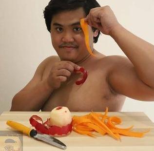 小哥用削皮器,削了大量苹果皮。紧接着小哥将这些苹果皮一片一片粘在了身上。