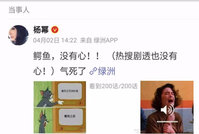 杨幂在微博平台上发布的微博,上面赫然5个大字:鳄鱼,没有心!配上了汤姆猫的表情包以及《鬼灭之刃》漫画200话的进度标志。鳄鱼指的自然就是《鬼灭之刃》漫画作者鳄鱼老师,而200话的进度也说明了杨幂刚刚看完炭治郎死亡的章节,还没等她接受炭治郎死亡的事实,便收到了热搜微博上炭治郎鬼化的信息,心情复杂之下发了这则微博。