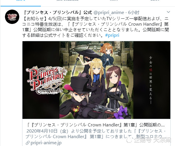 这是在“Princess Principal Crown Handler第1章”的官方网站上告知的。鉴于政府发布的受新冠疫情影响的相关消息宣布做出决定的。延期后的公开日期目前尚未确定。有关今后该作品的公开时间请等待作品的官方网站和官方SNS的公布。确定公布后,小编也将会及时跟进。