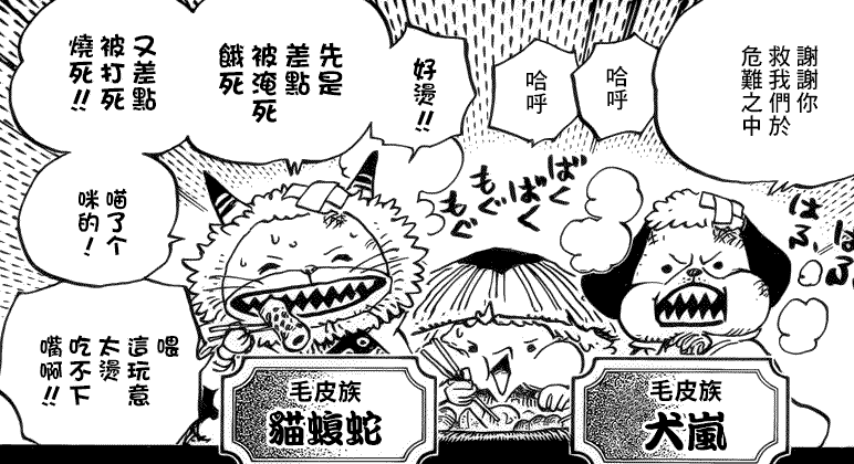 九里的海滩来了2个奇形怪状的动物,很久以前皮毛族跟光月家就缔结联盟,猫狗出海准备去和之国,到了和之国以后河童发现了猫狗,3个人都被和之国的人绑了起来,御田正好下海抓关东煮的材料,顺带把这3人救了,这3人就跟着御田了,御田看到这些从未见过的生物,河童是鱼人,猫狗是皮毛族,对于出海又有了更大的兴趣