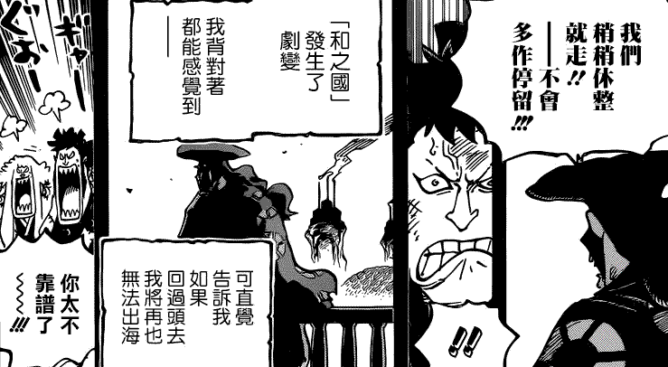 在后面的航海中也遇到了历史正文,并没有详细描述,时夫人这个时候病倒了,罗杰海贼团把时夫人送到了和之国,犬岚跟猫蝮蛇也一起留了下来,和之国现在已经水深火热,锦卫门等人迫不及待的想把真实的情况告诉御田,但是时夫人阻止了锦卫门一行人