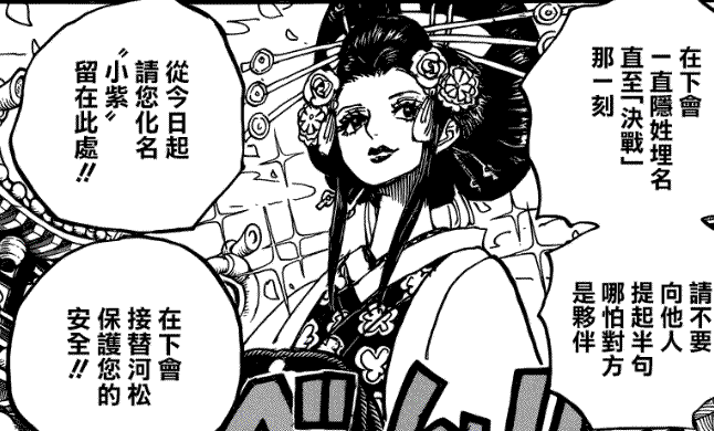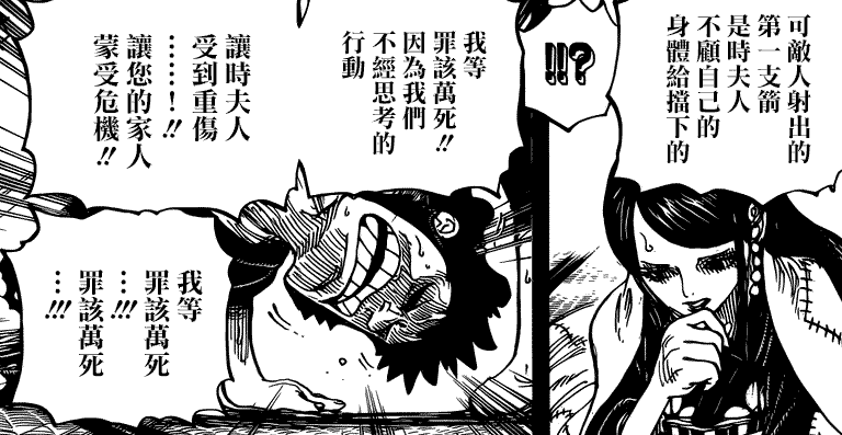 时夫人的箭伤在大腿,御田看到时夫人的上非常愤怒,打算直接去找大蛇报仇,御田前往花之都的路上,已经有凯多的部下告诉大蛇御田前往花之都了,御田一路伤到大蛇门前,准备直接杀死大蛇