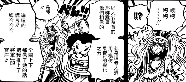 城镇的人欢呼着说御田一定能打到凯多赶走大蛇,御田大喝我父亲是让你做将军到我回来为止,现在把将军的位置还给我,但是黑炭大蛇已经用那个老太婆的模仿果实能力,模仿寿喜烧让黑炭大蛇成为了正统的将军