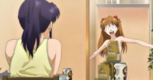 比如在经典动漫《新世纪福音战士》里,就有主人公从浴室里冲出来的画面,这时候的主人公肯定是不适合展现在观众们面前的,所以导演巧妙地用啤酒做遮挡物进行了遮挡。