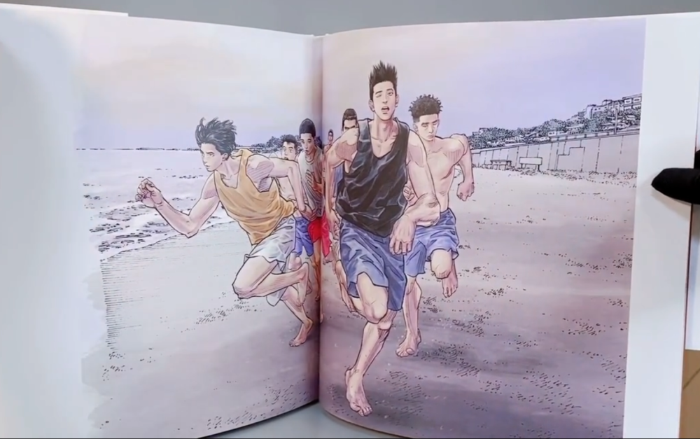 这幅原画的故事时间点应该是《十日后》之后,冬季选拔赛之前。井上雄彦很喜欢在原画集中画一些《灌篮高手》完结之后的故事,这一点在原画集1中已经体现得非常明显。在湘南的海岸线上,仙道作为队长已经开始带领新一届的陵南进行刻苦备战,除了黄色背心的越野会被第一眼误以为是流川枫之外,鱼住和池上也出现在了画面之中。鱼住身穿12号球衣回归参加冬季选拔赛在井上雄彦1998年发布的《灌篮高手》挂历中就已经交代,而这本挂历的封面原画也被收录进原画集2中。