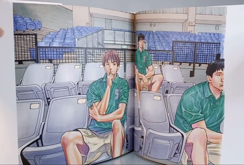 除了五支配角球队的故事再次被井上雄彦拿出来交代之外,在这次全新的14幅原画中还有三张黑白原画。首先是湘北体育馆中的樱木花道和流川枫,从樱木的球鞋来看这应该是两人在全国大赛前一对一之后的画面补充。其次是平冢体育馆被湘北击败的陵南三巨头和石田纪念体育馆中被湘北击败的山王工业七人组。其意境表达无需解释,通俗易懂——青春的那些失败!