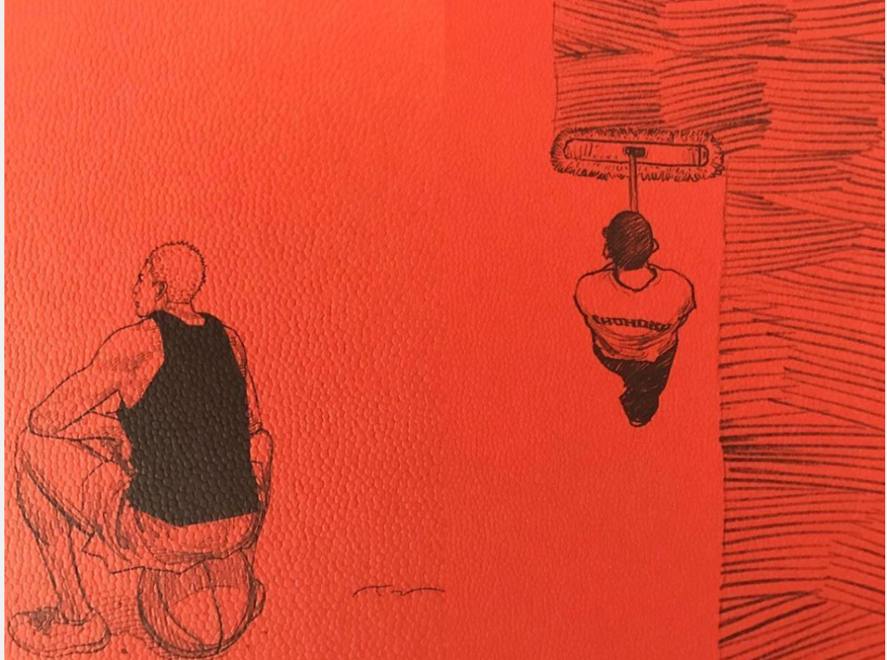 海南大包小裹的出现在街头,是要出去集训还是全国大赛后归来呢?三年级的全体球员都在,很难让人推测出这幅原画故事的时间点。或许在井上雄彦心中,他们也都要参加冬季选拔赛吧!