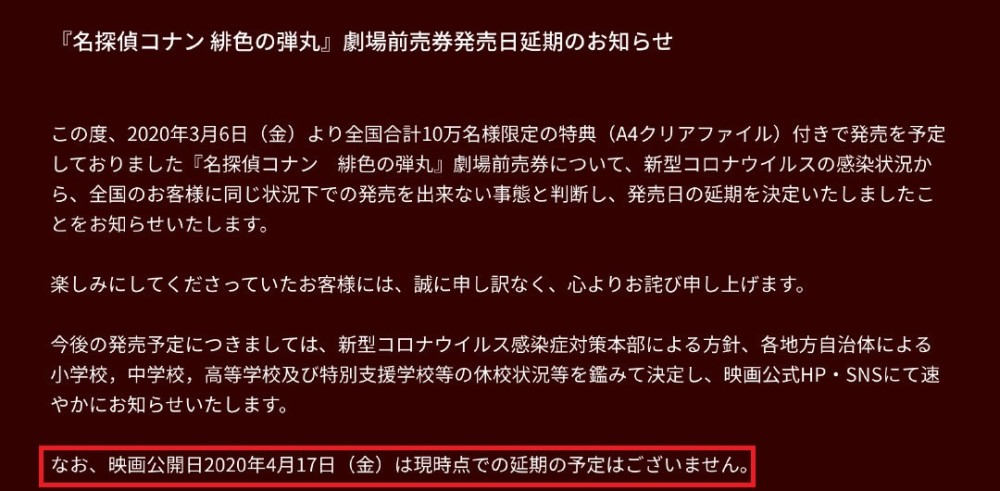 第一个便是,之前购买的预售电影票,在延期后定档放送时也能够使用;第二个则是,关于柯南M24剧场版的最新消息,也可以在其官网中了解到;第三个则是关于延期后的预售票剧场版的发售时间,也等之后再宣布;第四个则是原定于4月6日播出的特别节目也将延期。