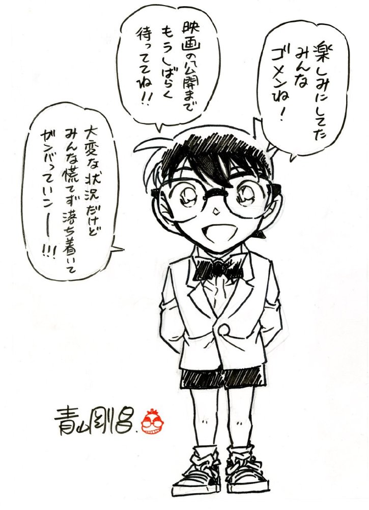 作为《名侦探柯南》的作者,青山刚昌在官方放出延期的消息后,也是亲自作画并献上寄语,寄语中主要表达了对柯南的粉丝们表达了歉意,接着他说明了现在疫情的严重,希望大家能够冷静下来,多等一阵子,大家一起努力!