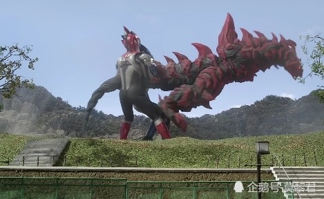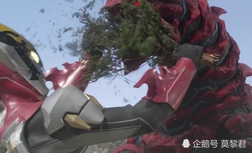 接下来就是比较经典的动作了,罗索奥特曼拿起了一棵松树,在挥舞了一阵之后直接填在了怪兽的嘴里。其实在奈欧斯奥特曼的第一话中就出现过同样的画面,奈欧斯同样拿着一棵树填在了怪兽的嘴中。