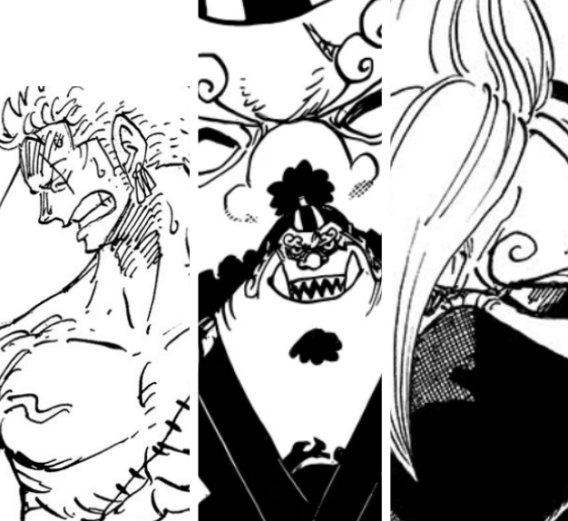 其实之前早就告知我们真相了,杰克可以在海里生存,那么他对位必然就是甚平了,而King身上有两把佩刀,对付他的人自然就是剑客索隆,人妖奎因就不用说了吧,山治就是他的对手。路飞、罗和基德三人无疑就是要把凯多拉下水,至于能不能做到,就看天意了。
