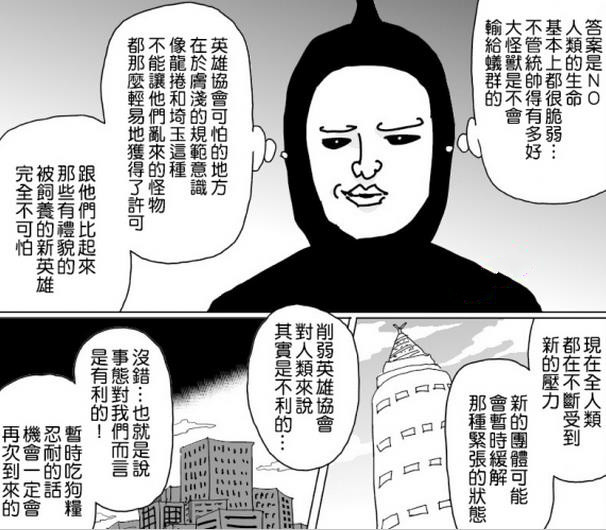 另外在这几话中龙级巅峰的怪人黑精再次出现了,在之前的剧情中黑精因为畏惧埼玉老师的实力而被迫成为了埼玉老师的宠物,但是从这一话的剧情中我们发现黑精并没有死心,黑精还是想靠着现在混乱的局面来打败埼玉老师东山再起,不过黑精还是低估了埼玉老师真正的实力,就算现在的局面再混乱,黑精也没有任何的机会打败埼玉老师。