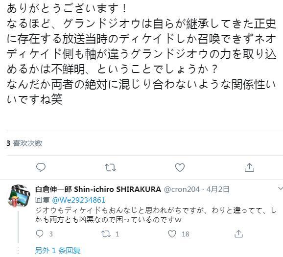 对此白仓意外的还进行了指正和回应,表示对于大部分观众来说,看起来不论是decade还是时王,两位骑士是一样的,但实际上本质是不同的,而且设定上两人都非常的凶恶,所以会让很多人感到困扰。最后还特意来了个笑脸的表情,可以说别有深意且非常的内涵。