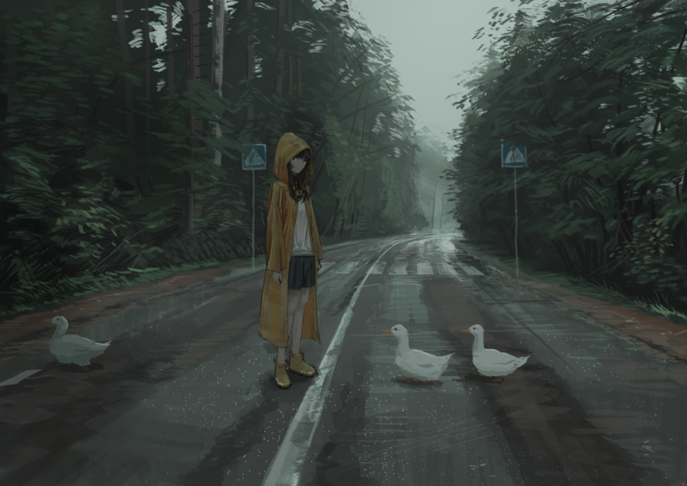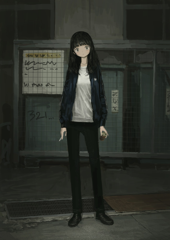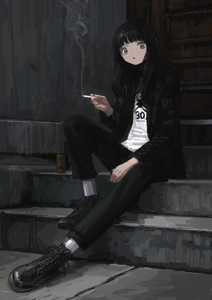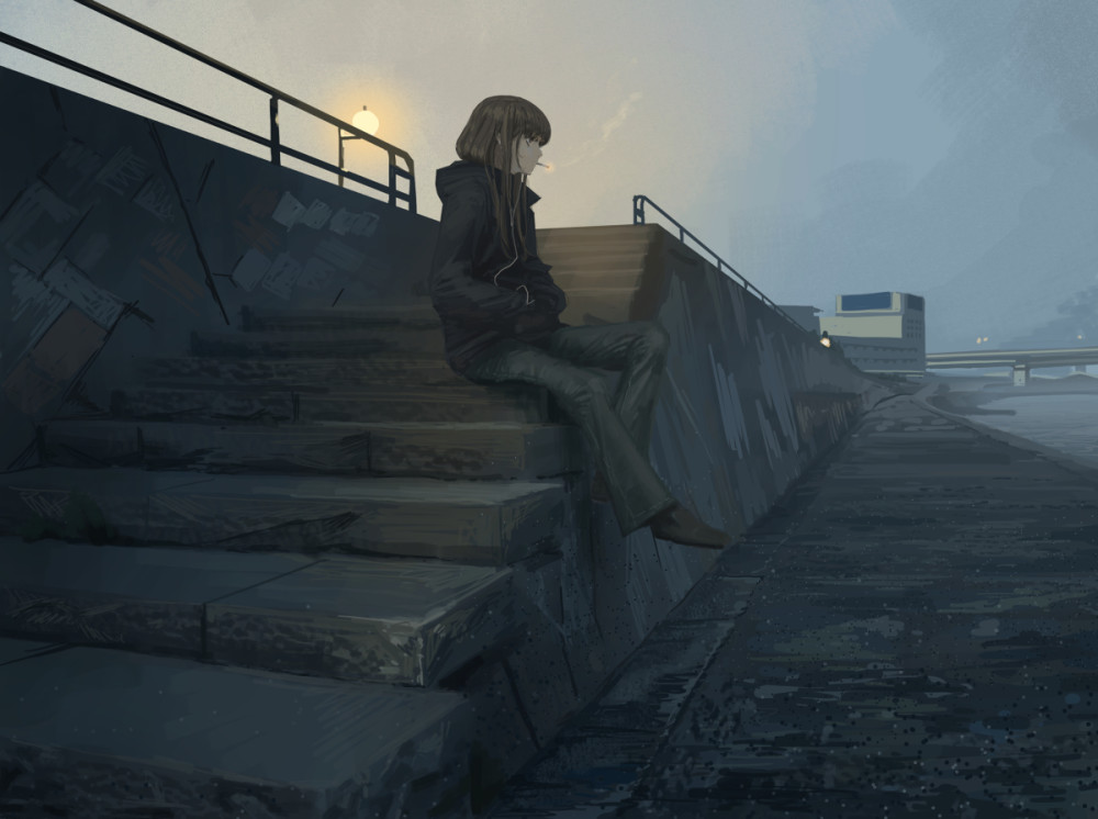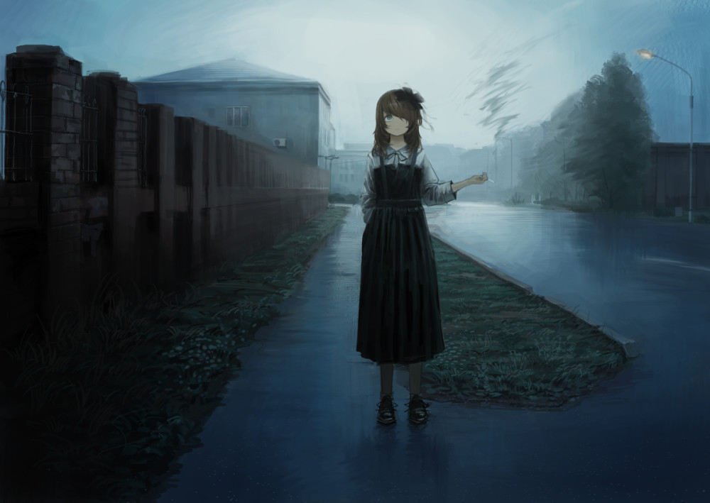 暴雨前的阴天,昏暗的阶梯小巷,破晓的桥边,在寂静无人的幽雅里,静静地站着一位黑衣少女。