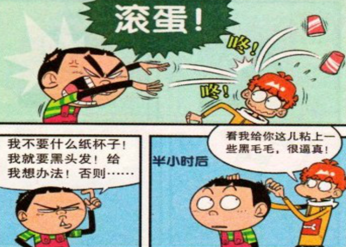 阿衰简直就是一个混蛋呀,大脸妹明确的跟阿衰说,自己不想要什么纸杯,也不想要什么古典造型,现在只想要自己有黑头发,让阿衰现在就给自己想办法,不然后果会很严重,赶紧的就帮大脸妹找来了一些黑色的毛毛,不过这些毛发哪里来的,大脸妹就不清楚了。
