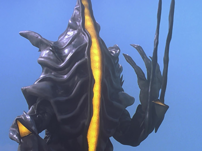 那红色的大眼睛似的东西实际上是一种拟态,真正的眼睛位于嘴状的部位。能够利用背上生出的翅膀以9马赫的速度飞行,主要的攻击方式是利用两手手背放出的破坏光弹和在空中使用的砍劈技。另外,还能够利用双手的利爪搓入彩色计时器夺取光能量,张开胸部时露出的红色结晶具有吸收敌人的光线并将其反弹回去的能力。它能瞄准奥特曼的弱点——彩色计时器,准确袭击了防卫军的主要设施,兼备高等智慧和武力。