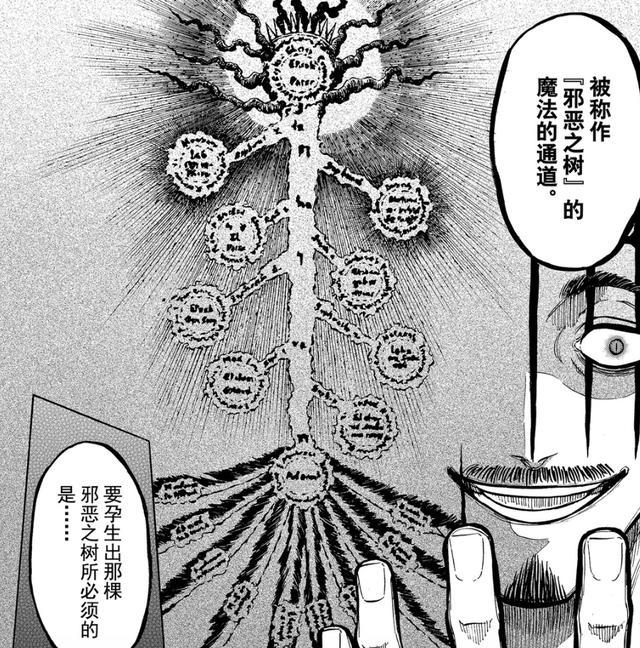 需要注意的是,在但丁的自述中他提到夜见与凡金斯都是开启冥府之门的钥匙。冥府与人间的通道被称为“邪恶之树”,这个设定源于犹太神秘主义中的“逆卡巴拉生命树”,意为不正当的精神能量。值得一提的是,与其相对的“生命之树”、“卡巴拉生命树”出现于精灵篇,由此可见黑色五叶草中有有三个世界,分别被这两棵树所连接。夜见和凡金斯之所以被称为“钥匙”,是因为世界树魔法和暗魔法能够孕生出邪恶之树。