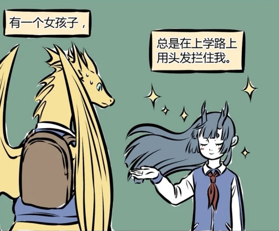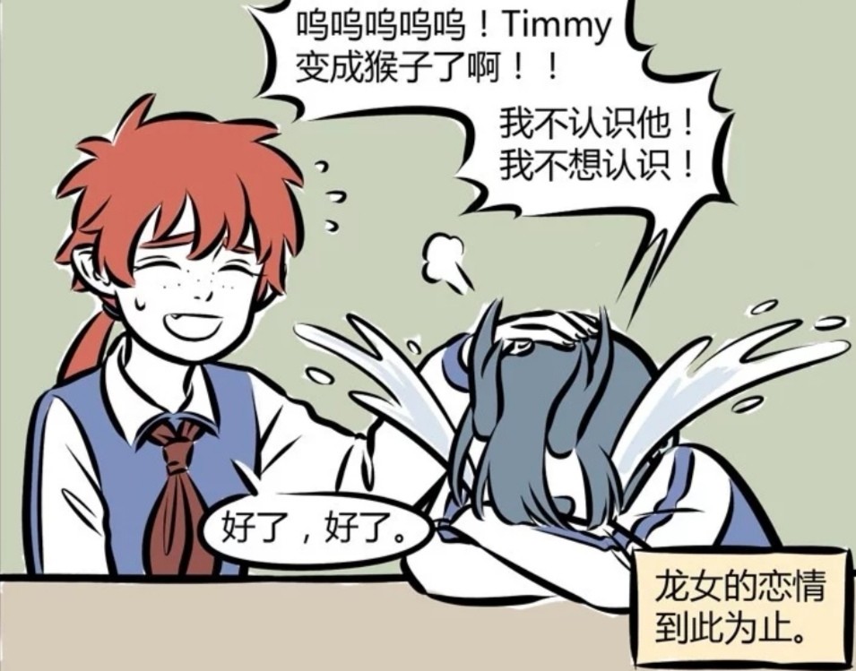 在《非人哉》漫画中,龙女和红孩儿基本都在一起,不过有那么一次龙女告诉红孩儿自己已经有暗恋的人,还是一条来自外国的龙,名为Timmy。龙女喜欢壮龙是公开的秘密,因为喜欢他而改变了很多,甚至穿上漂亮的裙子还学习喷火。不过龙女最终放弃了,因为这一条龙最终是变为人形,龙女觉得变为人形的Timmy像猴子,所以不喜欢