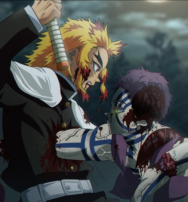 在这一场苦战当中,九柱只剩下了的水柱义勇与风柱不死川,身体状况也已经重度残疾濒临垂危。风柱再度起身的力气都已没有,面对如今的炭治郎,两小强也感到了绝望。伊之助即便有着坚定的定力,也无法对自己的伙伴“兄弟”下手,接下里一场虐心的大戏即将而至。鳄鱼老师的画笔为刀,恐怕不只是斩杀鬼杀队兄弟之间的羁绊,也是在拿粉丝的内心疯狂的蹂躏。在无限列车篇开启之后,九柱逐一被送上了刑场,鬼杀队的战力随着柱的逝去,也逐渐陷入了低谷。