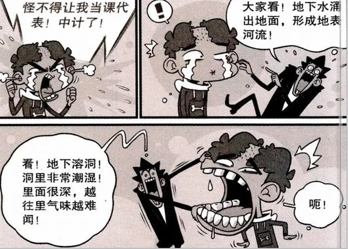 直到阿衰头发被当成森林剃掉以后,阿衰终于也是知道为什么金老师要自己做课代表了,看来阿衰是中了金老师的计谋了。阿衰大哭眼泪是河流,金老师就给同学们说这就是水涌,形成地表的河流!然后金老师又掰开阿衰的嘴巴,说这就是地下的溶洞!阿衰现在就是任由金老师摆布了。