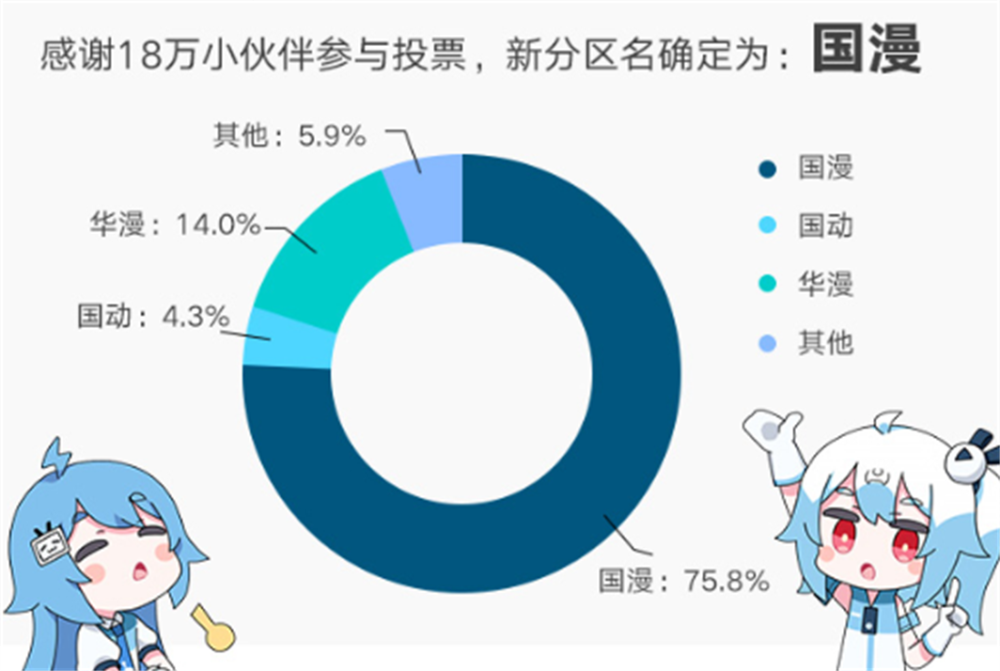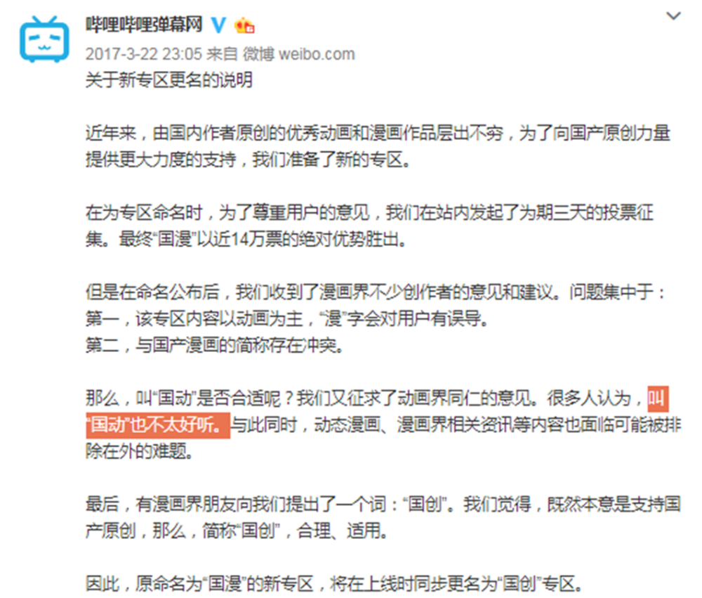 最早B站是没有国产动漫的分区的,而都是归到了番剧下面,而后来随着优秀国产动漫越来越多,才开始准备专门做一个国产动漫的分区,在2017年的时候,B站为新分区发起了投票,其中“国漫”一词以14万票的绝对优势胜出,而且当时参与投票的几个词也是没有“国创”一词的。