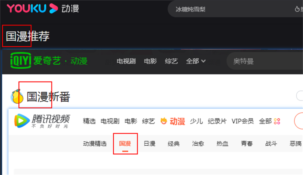 嘟嘟又去优爱腾分别看了一遍,依旧叫做国漫,不过人家本来也是大网站,这个分区也是叫了很久了,不会轻易被改变的。而且提起如斗罗大陆、狐妖小红娘之类的动漫时,很多小伙伴的第一反应也是国漫,而不是国创。