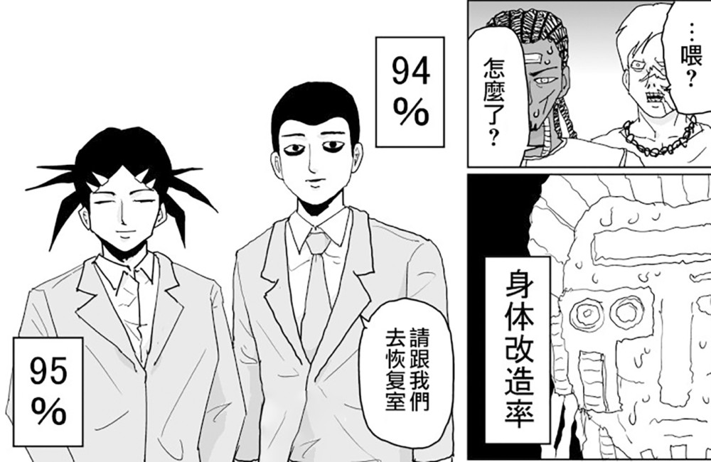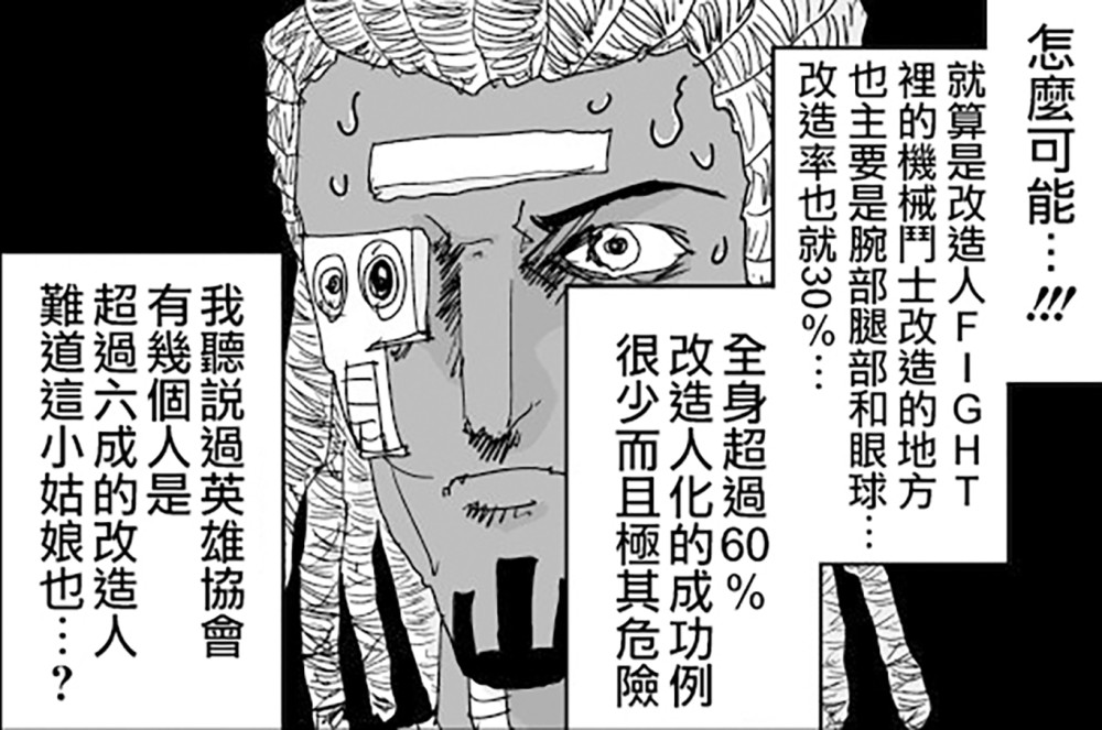 ONE老师引进新的设定“改造率”,杰诺斯改造率成为粉丝讨论的焦点。在125话中,ONE老师引入新的设定,那便是改造率。通过改造人fight口中可以得知,改造率越高的改造人实力越强悍。杰诺斯身为改造人其改造率自然就成了粉丝们讨论的话题,很多粉丝认为杰诺斯的改造率很可能接近100%,因为杰诺斯连脑袋都是芯片,从OVA中杰诺斯被埼玉老师一掌拍成记忆错乱就可以看出来。