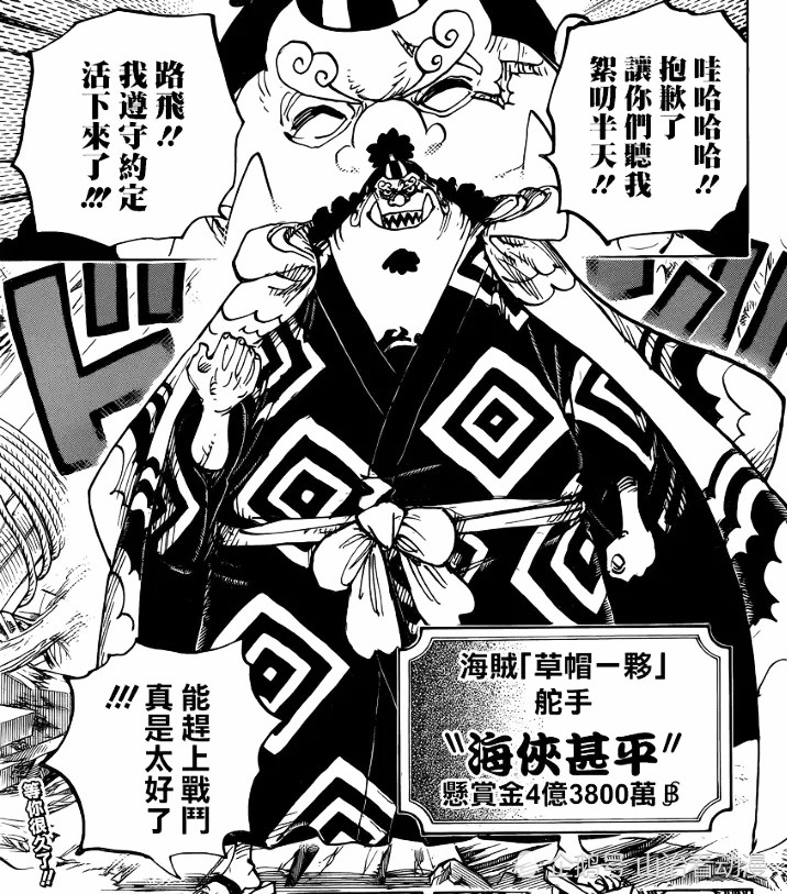 最新一话最大的亮点就是甚平回归草帽一伙,甚平及时出现在和之国,并击沉了百兽海贼团的船只,毁了他们的长炮攻击。甚平直接成为草帽一伙第九名伙伴,担任舵手一职,悬赏金4亿3800万贝利。甚平加入草帽一伙,连基德,罗都感到了震惊,这可是前所未有的事情,原七武海海峡甚平会加入草帽一伙。草帽一伙的实力瞬间提升一个档次,与基德,罗的海贼团拉开距离。