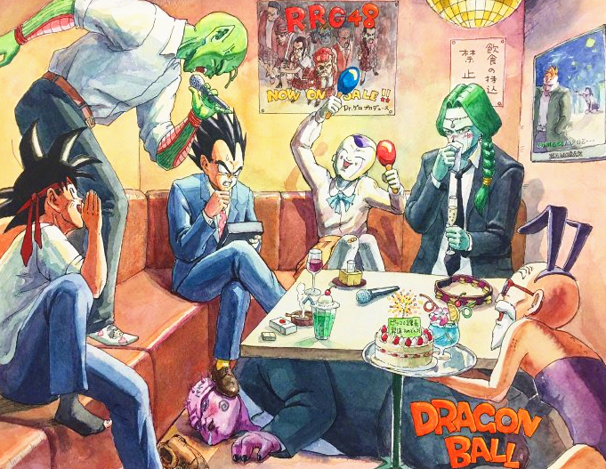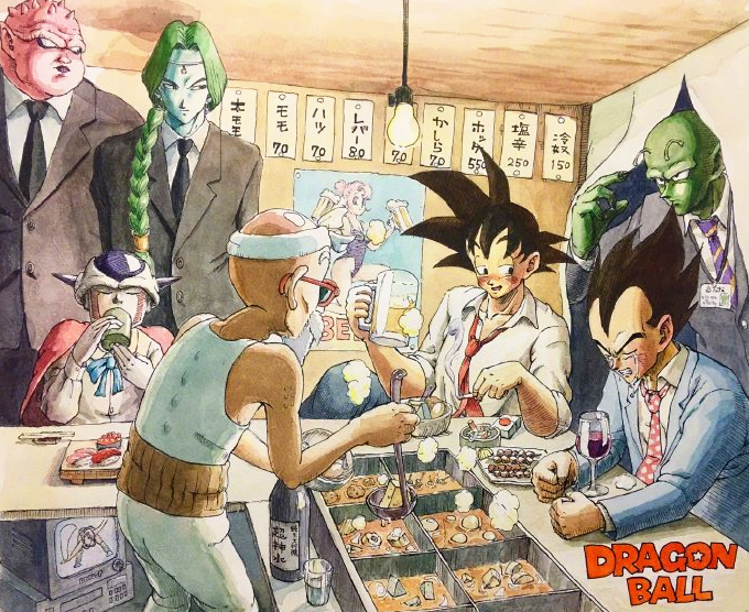 大家有想过所有战士们其乐融融的在一起吃饭喝酒吗?看看这个场景吧,没有了战争,龟仙人开起了料理店,弗利萨在旁边怡然自得的喝着东西,悟空一副喝高了的模样,旁边的贝吉塔和比克也都存在着,这样的场景,哪怕是现在的动漫中,也见识不到吧!