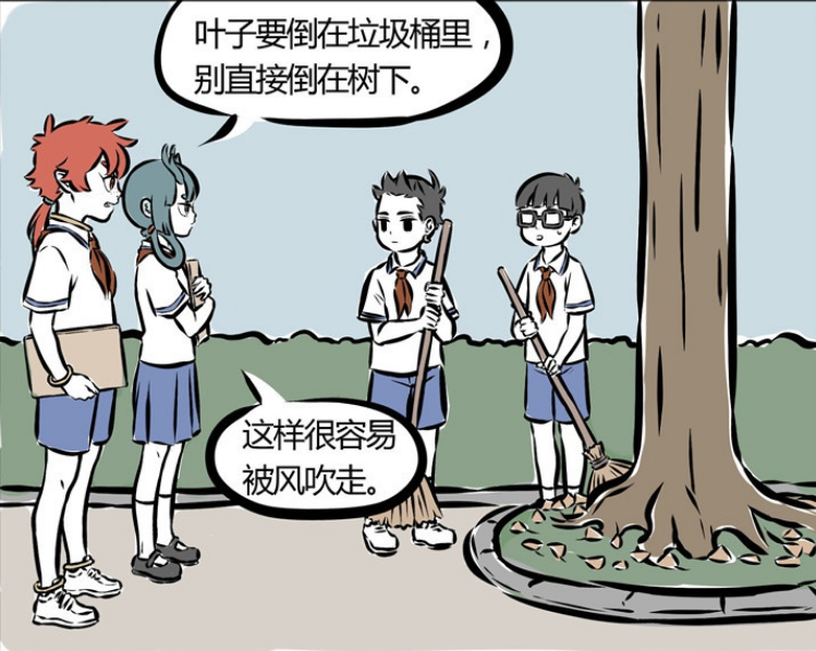 哪吒的好日子也确实到头了,这天他在和班长一起打扫卫生结果谁知道又被针对了。红孩儿非常神奇地说:“叶子要倒在垃圾桶里,别直接倒在树下,这样容易被风吹走。”一米四的哪吒很无奈的看着对方,大家都是朋友,你不能因为我长得帅就不停针对我吧?