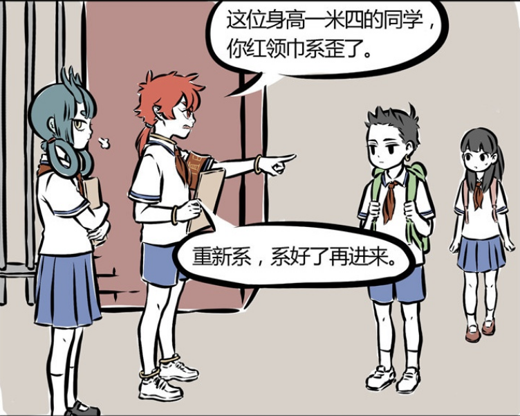 倒霉的哪吒被红孩儿疯狂针对,就连上学时也会被红孩儿针对。红孩儿指着哪吒说:“这位身高一米四的同学,把你红领巾弄好再进学校来。”哪吒无奈的看着红孩儿,身高一米四怎么了,你估计也就一米五。一米四的哪吒此时心里很无奈。