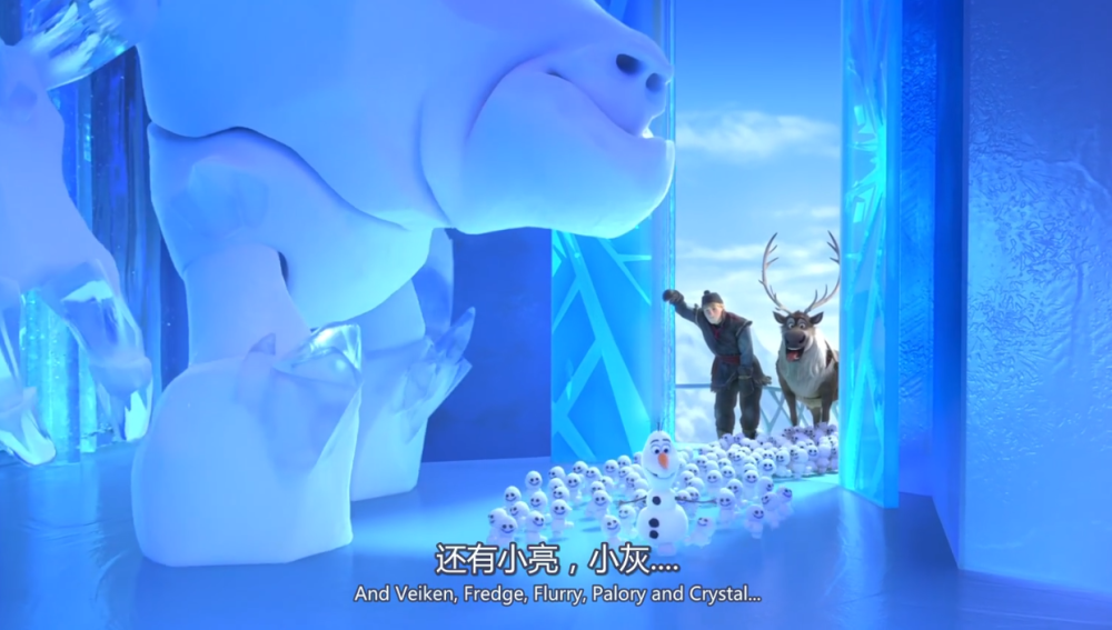 雪宝还给他们都起了名字,什么小亮小灰、小红小绿,其实每只都是白色的,而且长得都一模一样,不知道雪宝是怎么认出来它们的不同的,可能是靠着兄弟之间的羁绊吧,如果《冰雪奇缘》真的能出第三部的话,小雪宝们说不定就有可能登场了吧。