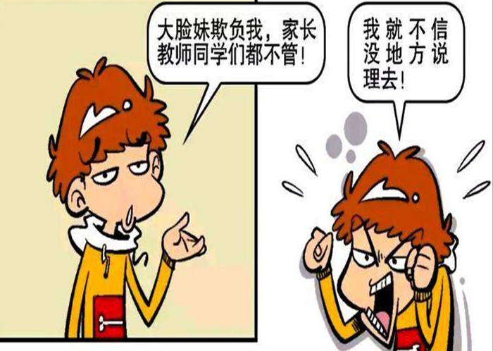 阿衰在学校真的是被大脸妹欺负怕,现在家长老师同学们都是看阿衰被欺负也不管了,这让阿衰怎么办好呀,阿衰都感觉自己已经被孤立起来了,可能大脸妹太过于霸道,所以学校都没有人敢管大脸妹了吧,但是阿衰作为大脸妹的同桌,每天就被大脸妹欺负,还没有人帮,阿衰感觉到很无助,想着一定要找个地方说理去。