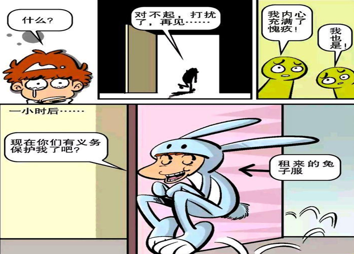在阿衰得知了自己来到的是动物保护组织,阿衰脸僵住了,只能不好意思打扰了,然后直接出门。可是在一个小时过去之后,阿衰又来了,这个时候的阿衰假扮成兔子,来寻求动物保护组织的帮助,希望动物保护组织能够帮自己惩罚大脸妹,来保护自己。可阿衰真的就觉得自己假扮兔子就是动物了吗?阿衰这个样子动物保护组织也是管不了的啊!