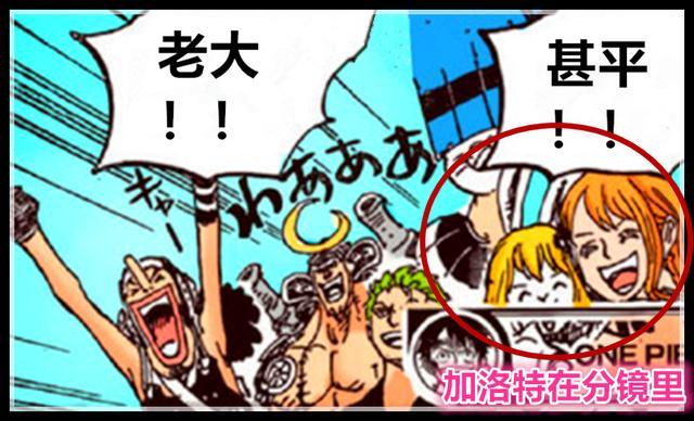 作者尾田添加的第10人证据里,便是加洛特与娜美,索隆,乌索普,弗兰奇同框,一起欢迎甚平老大的归来。