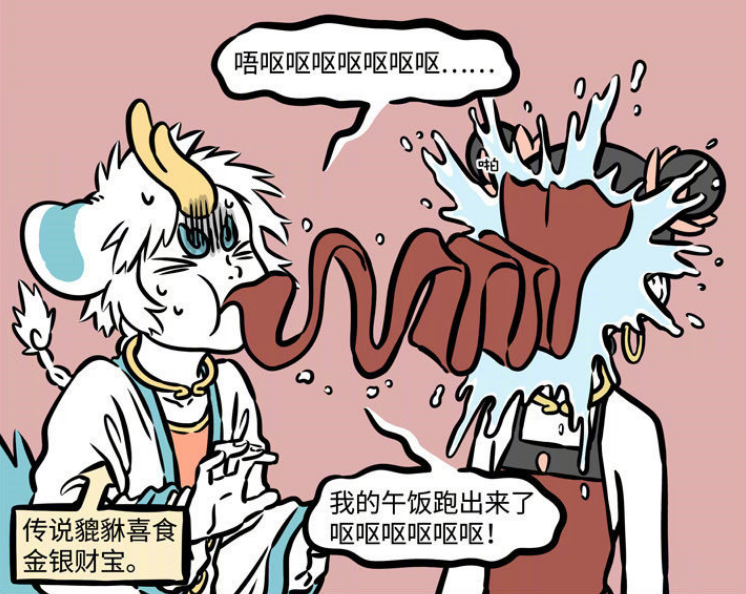 非人哉中皮皮本体是貔貅,传说中他非常喜欢金银财宝。而在非人哉中他非常喜欢吃各种法宝,哪吒的混天绫就曾被他吃进肚子里,不过在哪吒的召唤下皮皮将混天绫给吐了出来。