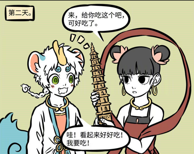 知道皮皮喜欢吃什么后,哪吒就拿来一个宝塔给皮皮吃。看宝塔的样子肯定毫无疑问是哪吒老爸的托塔天王的法宝。肯定哪吒看到自己的混天绫被吃,调皮的他就想到了自己老爸的宝塔。不知道李靖知道自己法宝被吃后会怎么样。