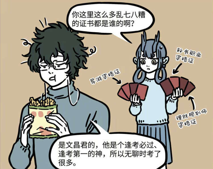 非人哉中文昌君是掌管考试运气的神仙,而白泽是通晓万物的神兽。在学习方面白泽能力更强一些因为白泽是文昌君的老师,龙女这天拿着白泽的各种证书询问:“这些都是谁的呀。”不光有秘书资格证书还有导游资格证,白泽无语地告诉龙女那都是文昌君的。