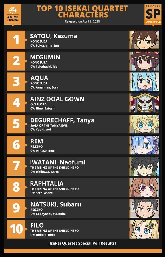 最让人意外的,大概还是前三名,被异世界搞笑组《为美好的世界献上祝福!》的主角团全占了。虽然达克尼斯没有上榜,但是这份成绩单也是非常不错了。而第一名竟然是鬼畜真我是真的没想到,虽然看完红魔族传说以后我也喜欢上这个有色心没色胆的宅男。