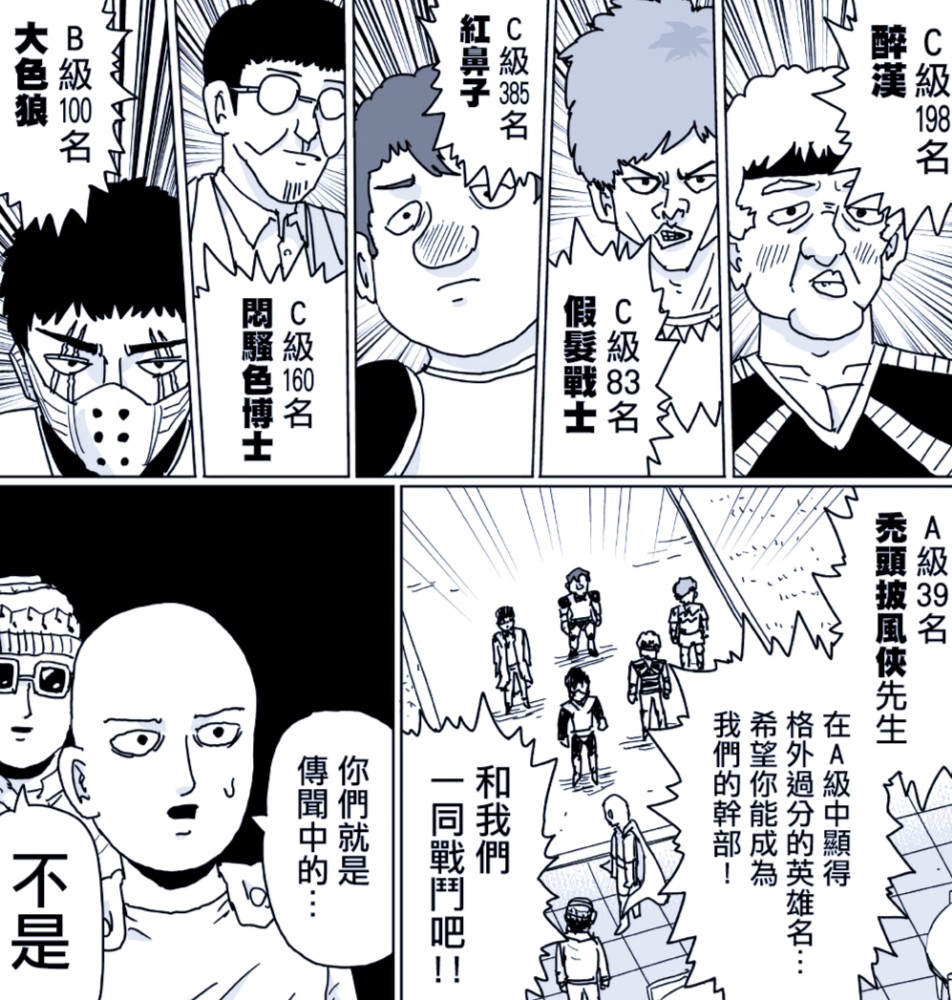 代替NEO的邀请,「英雄受害者会」前来让埼玉当他们的干部一起战斗,见识过他们的英雄名,看来埼玉还是挺好的,还有个「侠」的名号。