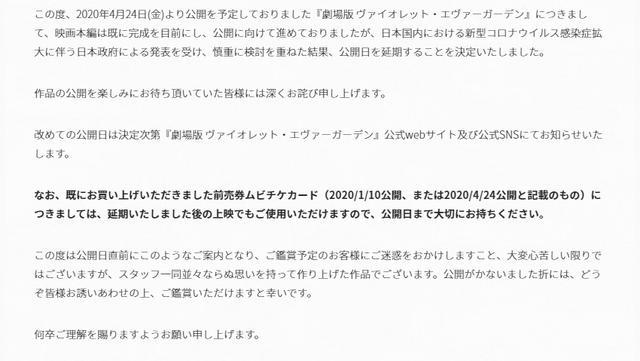 本应一月份就该上映的《紫罗兰永恒花园》因为京都动画的纵火事件,大量的数据和主要的服务器文件全部丢失,所以不得不第一次延期。就在我们期待的延期日期已经到了的时候,突然迎来大面积的新冠病毒传染,于是不得不二次延期。不得不说真是一部“多灾多难”的动漫啊,暂时上映时间还未决定,各位粉丝们继续期待吧!