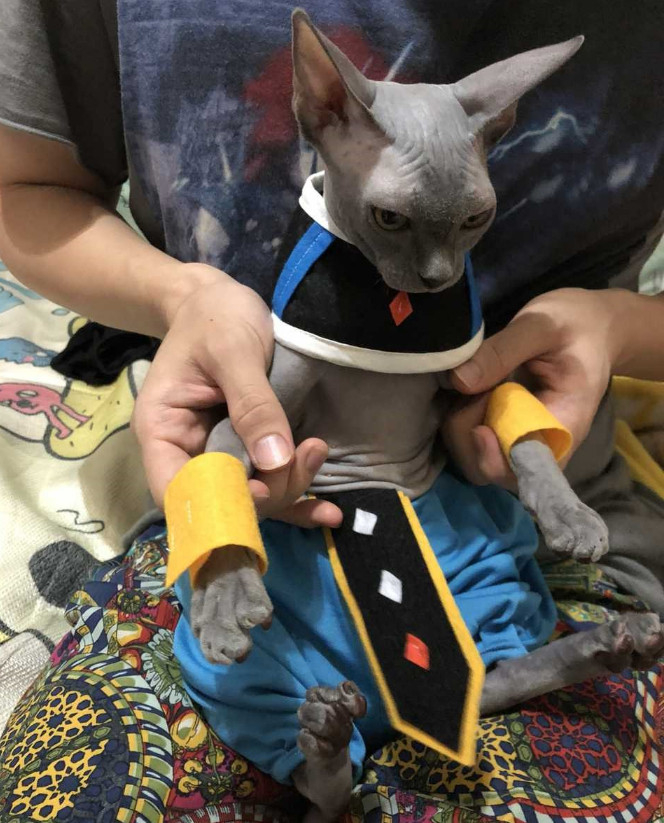 在《龙珠》中登场的破坏神比鲁斯,则是以鸟山明家中的科尼斯雷克斯猫为原型,并且结合埃及神明阿努比斯的服饰所创作的,而比鲁斯具备这轻松破坏一个宇宙的实力,那么在网上就有一位小哥将自己家的猫cos成比鲁斯,即便品种上不同,但是这个cos的比鲁斯却相当还原。