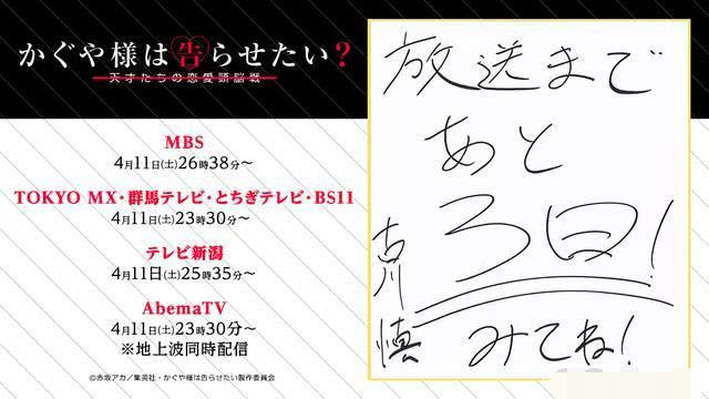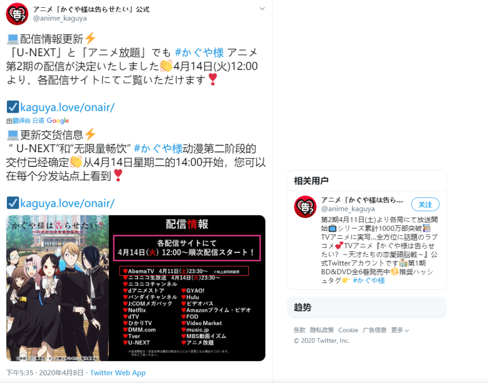 根据动画官方推特在4月8日所发布的最新消息来看,《辉夜大小姐想让我告白》第二季的播出时间没有任何改变,所以,那些还在担心的观众们也不用担心了,《辉夜大小姐想让我告白》第二季已经基本上可以确定不会延期播出了。当然,正所谓“计划赶不上变化”,在还未播出之前,任何事情都是有可能会发生的。不给,官方推特的最新消息又确定了两个平台的播出时间,也可以看作是一颗“定心丸”了。